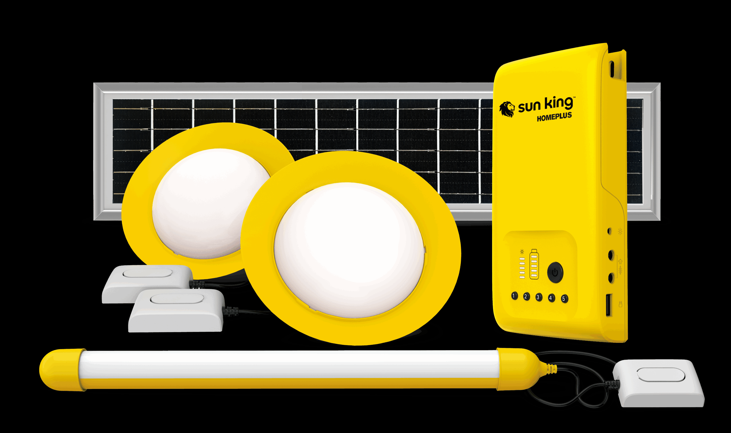 HomePlus is an affordable and easy-to-install solar home system that provides essential lighting and phone charging to homes and businesses with limited or no access to electricity. The system features three lights with a total output of 480 lumens that can be linked to illuminate multiple rooms, a battery control unit, and a 7 W solar panel. Each light has three different lighting modes, individually adjustable via a wall-mounted switch. The battery control unit has one USB port for charging feature phones, as well as a convenient dock to hold the device in place.